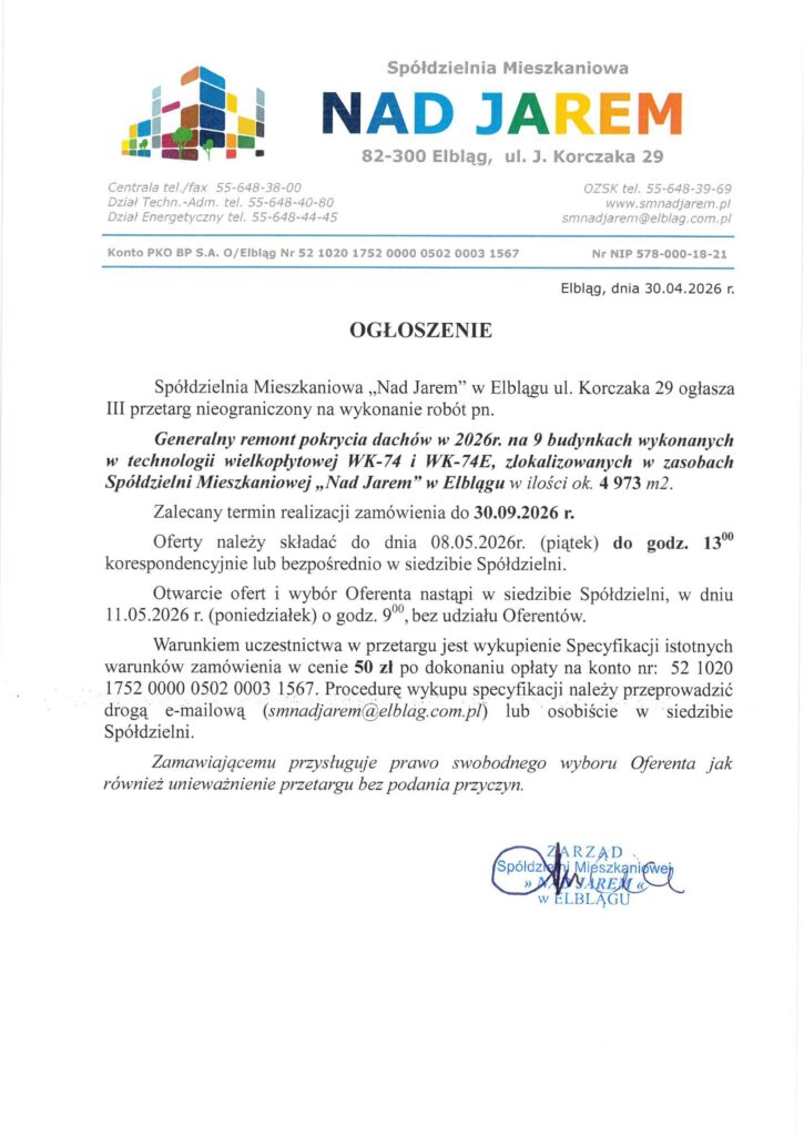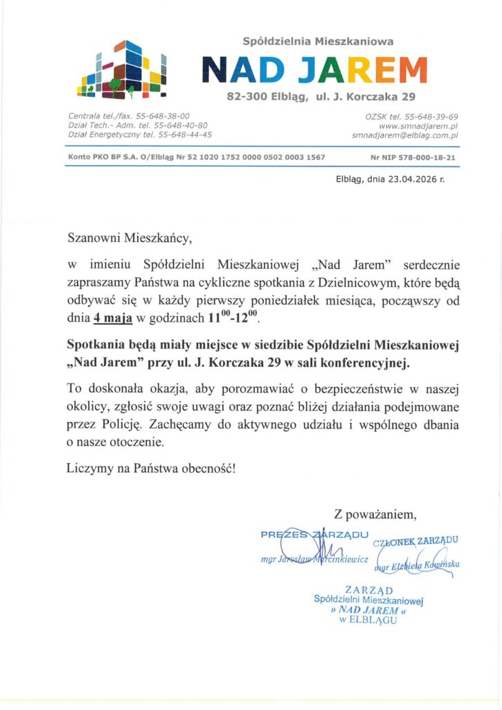 - administratorem Państwa danych osobowych jest Spółdzielnia Mieszkaniowa „Nad Jarem” w Elblągu, z siedzibą przy ul. J. Korczaka 29, 82-300 Elbląg, tel.:55 648 38 00;